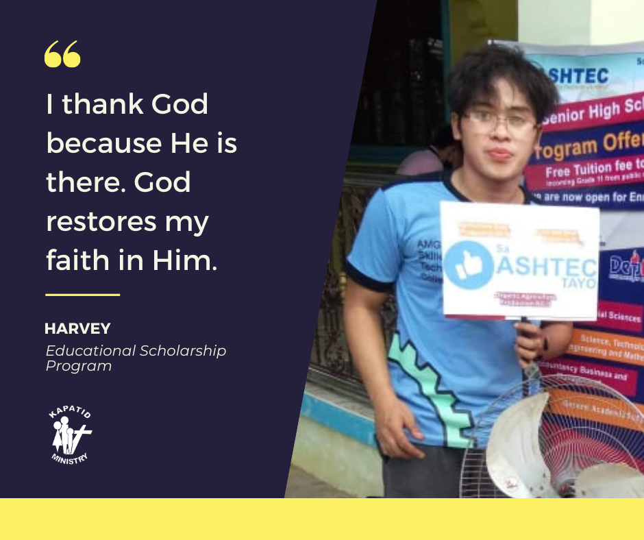 I’m Harvey Abad, 22 years old. 2nd born child of my parents. My father worked as a company driver while my mother is a housewife. I stop studying last 2019 because of the lack of financial support. Then I decided to work and help my family. I work as a factory worker. When my work contract ended, I become a person who hangs around. My sister helps me to back to my studies. She recommend and enrolled me in AMG Skilled Hand Technological College with the help also of Kapatid Ministry. I took Electronics Products Assembly and Servicing NC II they thought me a lot of things about how to assemble electronics and also become close to God. I live in the campus dorm and it is very far from my family and friends. I got homesick because I miss my family. I just praying to God for their protection and guidance. Living by myself and doing things alone makes me realize that life isn’t easy. I thank God because He is there. God restores my faith in Him. My goal now is to finish my studies and find a decent job to help my family. I always pray that God will always give good health to my family.