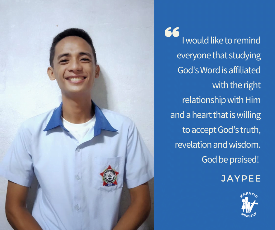 I am Jaypee A. Manalo a college student and a grantee of the scholarship of Kapatid Ministry. I just recently won and got 1st place in the Bible Quiz bee organized by KMI. God honors preparation. This quote is my ground as I ponder upon God’s word in preparation for the Bible Quiz bee. I reviewed for the Bible Quiz bee by meditating upon God’s Word with the desire to bring back the glory to God. Also, I asked the leading of the Holy Spirit through prayer to enable me to understand and apply His word in my personal life. I believe that if you are guided by the Holy Spirit and your motive is for His Glory, He will surely grant the desires of your heart according to His will. The challenges that I encountered as I prepare for the Bible Quiz Bee was that I feel anxious about how I will be going to answer the questions. Likewise, I found it hard to schedule my time in reviewing since there’s a lot of responsibilities that I need to accomplish. However, God has a solution to every challenges and this time He showed me that no matter how occupied you are it is a must to always choose and prioritize your devotion to God whether it is a form of Quiz bee or your personal time with Him. The Lord is indeed faithful to me during the Quiz Bee for he empowered me to recall all the things that I reviewed. He also revealed to me the true essence of that activity and that is to become rooted and to know God deeply in our lives. I would like to remind everyone that studying God’s Word is affiliated with the right relationship with Him and a heart that is willing to accept God’s truth, revelation and wisdom. God be praised!