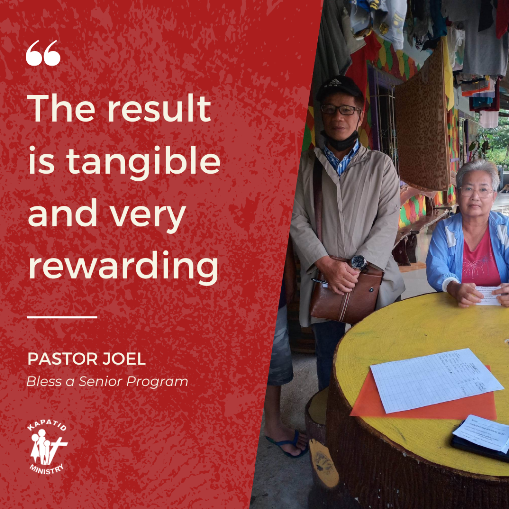 They are really blessed and appreciate the talks and having time with them. After the sharing and praying to give of goodies. A great privilege to be one assigned for them to bless. This ministry of Kapatid is wonderful. Giving time and blessing those seniors. As a church, we can’t do this without the support and supplement assistance from KAPATID MINISTRY. The result is tangible and very rewarding. This is the Bible way in a practical and most appropriate to remember the needy, sickly and neglected. Without any hard obligation to them to visit our church. The giving is mutual. The grace is experienced by them. In teary eyes, they claimed the blessing.