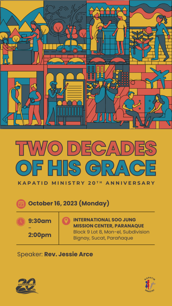 This month, Kapatid Ministry, inc (KMI) is celebrating its 20th year Anniversary: Two Decades of His Grace. As our partner and co-laborer in God’s Kingdom, we are indeed very grateful to you for continuously praying with us and for your unfailing support to the ministries entrusted by God to KMI. You were with us thru thick and thin, thru hardship and abundance and we have experienced how God is using you to expand His ministries. It is our fervent prayer, that through you, God’s purpose in our lives and in the lives of those God has led/brought to us shall be fulfilled…that His Name maybe glorified and many will come to know and accept Jesus Christ as our Lord and Savior.