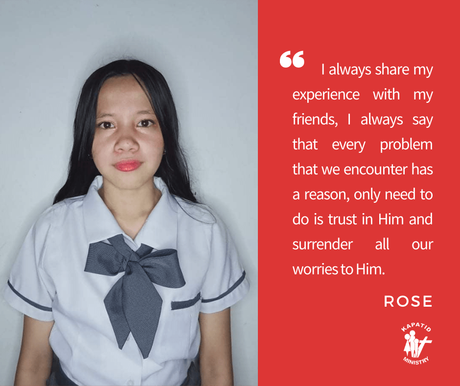 At the beginning of the pandemic, everything was easy for me, but it lasted for about two months as we barely have anything to buy food because my sister and father’s job was almost affected. There was a time that we needed to borrow some money to buy. But I thank God because He used many people around us to help our family. Until the year passed, I didn’t expect that I was hurt so much. I was in pain at that time, and I don’t want to believe it. I did not expect that the most precious person in my life would have left me. Yes, my father died after that many problems happened. My older sister’s salary was not enough. It was the biggest pain and problem I had in my life. I know that everything I’ve experienced this year is a challenge to the point that I want to give up.